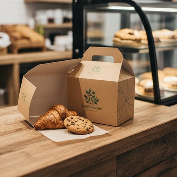 Solution: A custom printed gable box with 18pt coated stock, CMYK wrap, cellulose window, and die-cut insert for pastries. Order size: 1,000.