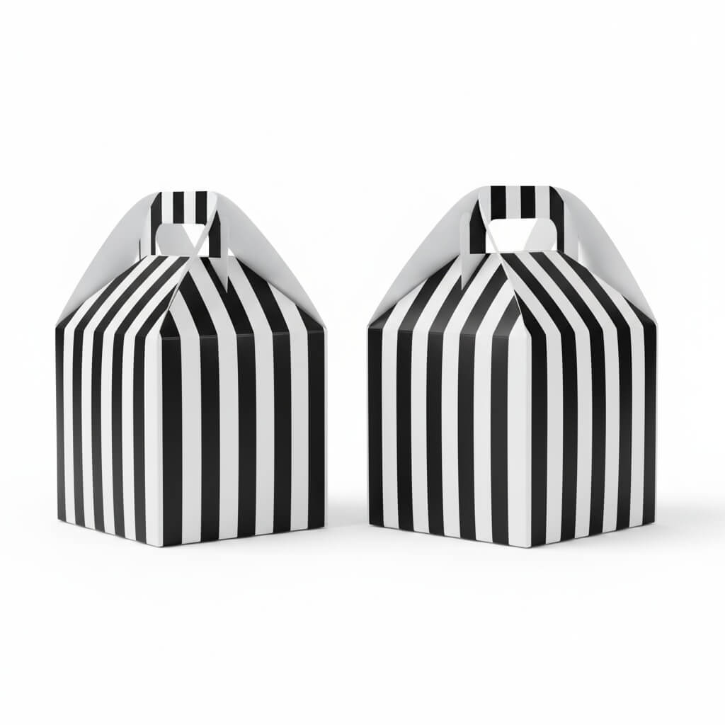 Custom striped gable boxes combine a nostalgic gift box shape with a modern printed pattern that performs. They are portable, practical, and very shareable. Use them for party favors, retail product bundles, promotional kits, food takeout, and seasonal gifts. Compared to plain kraft takeout boxes, printed striped gable boxes make products more giftable, encourage social shares, and increase perceived value.